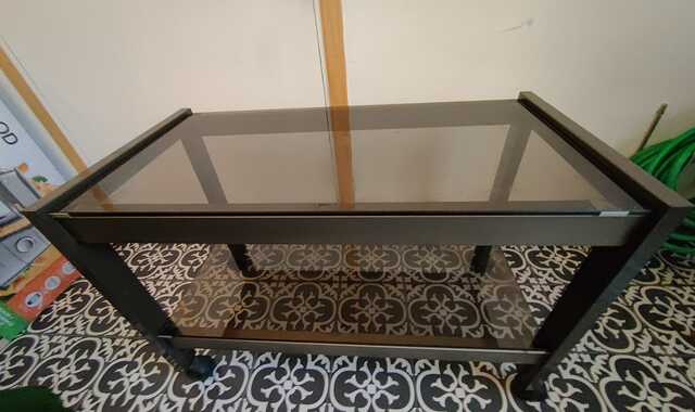 Donne table sur roulette, état correct, structure en alu plateau en verre fumé